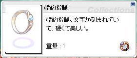 | 2.すぐ右隣に釣りをさせてくれる青年ダナイというNPCがいます。 話しかけると、エサと利用料として「化け物のエサ」と50zが必要だと言われます。 材料を持ってくると釣りをさせてくれます。 何回か繰り返すと、指輪をつり上げられます。 材料は、毎回いるので化け物のエサをたくさん用意しておきましょう。 結構確率低いような気がします (プロンテラ肉商人で店売り、マーター、クランプ、タロウなど) 成功すると「婚約指輪 成功すると釣りはできなくなります。 ○交換結果(OWNより転載、500回平均から計算) ・石 (40%) ・刺身 (10%) ・赤ポ (20%) ・黄ポ (10%) ・花の指輪 (10%) ・ダイヤの指輪 (1%) ・婚約指輪 (10%) (mtn様、情報ありがとうございます) | |