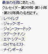 | 9.再びゼガンに話をしにいきます。 ここで下記の人物名を全て検索します。 レベイレブ ジャック・オー ジャン・ファードック クアーク・ドノン エマ・シアース ロイヤルミスト ナインボール クルセイダー第3中隊第1小隊第3分隊最後の任務 これらを全て検索してください。コピペで「シフト+Insert」でもOK | |