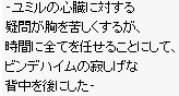| 10.アインブロックのホテルの「シドクス」に報告に向かいます。 そしてホテルの2Fへ行くと、部屋に足跡のような赤い砂が散らばってます。 シドクスに話しかけると体から血が出ており、まっ先に「ユミルの心臓」の事を伝えてあげます。 メッセージ入力画面が出てきますので「ユミルの心臓の欠片」と入力してください。 そしてシドクスに誰にこんな事をされたのか聞こうとすると「犯人は…」というところで 死んでしまいます。 | |