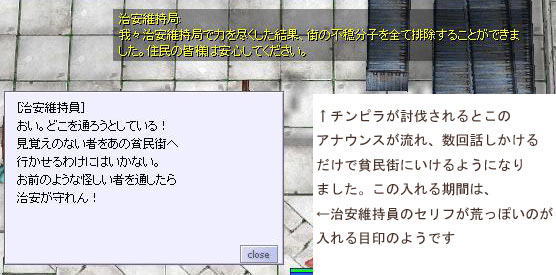 | 4.リヒタルゼンの中央右あたりにいる治安維持員に話しかけます。 ここで何回か話しかけるとスキを見て右側の貧民街へ移動できます。 行けるタイミングがあるようなので行けないときは全く行けなかったです。 「避難しなさい!」という黄色文字メッセージが流れてたので関係があり? ○富裕街と貧民街の治安維持員(通行証を持ってない場合) ・移動可能なときのメッセージ ・移動不可能なときのメッセージ(この時は何回クリックしても移動出来ません) ○黄色メッセージの流れ 治安維持局: 現在、街の治安が悪化しているため、住民の皆様には気をつけていただくようお願い申し上げます。 繰り返します。住民の皆様、お気を付けください。 ↓ 町内にチンピラ出現 ↓ 町内のチンピラ倒す ↓ 治安維持局: 我々治安維持局で力を尽くした結果、街の不穏分子を全て排除することができました。 住民の皆様は安心してください。 ↓ NPCに会話を繰り返すと貧民街へ移動できます。(一定人数で治安悪化?) ここを1回で通過できるようにするためには、通行証クエストをクリアして 「通行証」を手に入れる必要があります。この通行証は、他のキャラでも使用できます。 | |