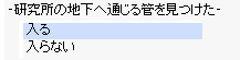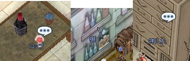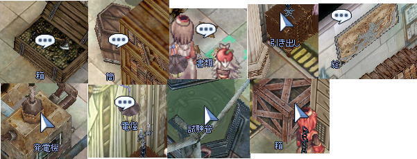| 9.[多角形の穴] ワインが置いてあるテーブルを見つけます。(右下の方) テーブルの上にある「コップ」をクリックしてコップの中身を出すと「さびたカギ」を見つけます。 次に本がいっぱいの机の上にある「棚」をクリックします メッセージ入力で「さびたカギ」と入力すると「緑のカギ」がもらえます。 次に箱の横にある「押入れ」をクリックします。 メッセージ入力で「緑のカギ」と入力します。 すると「多角形の模型」を手に入れることができます。 そして「箱」をクリックして多角形の穴を選択して「多角形の模型」と入力します。 3個の穴をすべて完了したら、もう一度箱をクリックして箱をあければ「研究所の通行パス」がもらえます。 装備欄のアイテムで装備したらアクセサリー扱いでしたが以下に進むには、装備してるとダメです。 | |