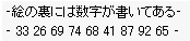 | 7.[楕円形の穴] 部屋の入ってすぐの「箱」をクリックして「斧を持ち上げる」を選択します。 その後、近くにある「筒」をクリックします。 ここでメッセージを入力するように言われるので「斧」と入力します。 すると数字版が出てきます。 その後は、机右側の下に「書類」を見つけてクリックします。 書類の中を探してみると「赤いカギ」が見つかります。 (国際では、カギなどは全てメッセージで手に入るだけで実際のアイテムではありませんでした。) それから部屋の右上のベッドの近くにある「引き出し」をクリックします。 するとメッセージ入力が出てくるので「赤いカギ」と入力します。 引き出しの中から「小さなナイフ」を手に入れます。 机の上側に「絵」がありますのでクリックします。 動かしてみると入力するように指示されるので「小さなナイフ」と入力します。 (ここで数字忘れないためにスクリーンショットを撮影しましょう!) すると数字が表示されます。全9個の2桁数字が出てきます。 よく見ると数字は、1の桁の数に 1 2 3 4 5 6 7 8 9 が含まれてます。 ここで、1の桁を低い順に整列してみましょう。 例)19 28 57 46 85 64 63 42 31の数字ならば 1の桁の数字は、9 8 7 6 5 4 3 2 1巡になってます。 これを低い順に整列すれば31 42 63 64 85 46 57 28 19となります。 次に10の桁だけ数字を見ます。すると3 4 6 6 8 4 5 2 1になります。 346684521 | |