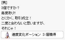 | 3.3箇所のうちスリが「ホテルの前」に現れたときに、近くをうろうろして 何回もゼニーを取られてると、スリを発見して捕まえます。 それから見逃してくれと言われて、お礼に「速度変化ポーション」を1個15000zで購入できます。 購入できるのは、3個までです。 効果は、一瞬だけ移動速度がかなりアップします。 そして購入し終えたら、また他の場所に移動してしまいます。 購入を断ってもNPCが消えてました。 | |