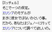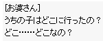 | 9.邸宅の外で出てきて「おばさん」にロシミエル邸の鍵を返してエリシアに対して尋ねます。 「エリシアはなぜ?」→「もう少し詳しく・・・」と選択すると ここでエリシアが自殺をしたという事実を知ることになり、 キル・ハイル学院の南で暮らす、魚師に聞くように言われます。 次に「おさしみ10個」が必要になるのでない場合は、アマツ(建物内)で購入しておきます。 | |