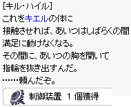 | 1.再び執事を通し、「キル・ハイルさんと話を・・・」を選択します。 キル・ハイルに話しかけて「エリシアについて」→「小屋で見つけた肖像画を見せる」 →「ロシミエル家の肖像画」→「ジェームズのメモを見せる」→「KHのメッセージ」→「・・・」を選択します。 もう一度話しかけて、「彼らは・・・」→「・・・・」→「望み?」→「??」→「承諾する」→「ある物?」を選択します。 そうするとキエルを防いでくれとお願いされ「制御装置」を手に入れます。 | |