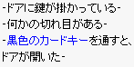 | 9.4番目の部屋 4番目の部屋は3番目部屋から出て上に突き当たりまで行けばあります。 部屋の左側に「機械人形」が4個あるので上から3番目「機械人形」をクリックすればモンスターが3匹現れます。 モンスターを全て倒せば「黒色のカードキー」がドロップされます。 ここでは「黒いカードキー」を2個獲得しなければなりません。 2個を所持したまま右側にある「大きなドア」をクリックして 「黒色のカードキー」と入力して次に進みます。 黒いカードキーがなかったり、1個だけ所持している場合には 入力ウィンドウだけ表示されてドアが開きません。 必ず2個を所持している必要があります。 | |
