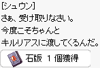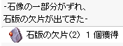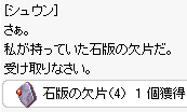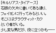 | 8.フェイヨンに行って、「グラウティット・カク」(182,132)に話します。 石板の欠片について聞くと、これまで探したものを10000zで購入させられます。 ここで「ブドウジュース1個」「緑ハーブ1個」「岩の心臓1個」「乙女の着物1個」が手に入ります。 そしてミニマップに次回る場所が表示されます。 4ケ所を知らせてくれて4種類のメッセージを順に探すことになります。 | |