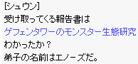 | 16.ゲフェン町の北にいる「シュウン」に話しかけます。 ここで選択肢が出るので「お願いします」を選びます。 もし違う方を選ぶとクエストが進まなくなります。 間違って選んでしまったら「白ポーション」を1個あげればクエストが進みます。 ゲフェンタワーに自分の生徒がいるという話を聞きます。 そして、書類の名前を教えてくれますので覚えます。 ゲフェンタワーのモンスター生態研究 | |