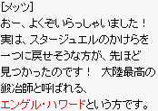 | 1.プロンテラ2時方向の建物内の「メッツ」に話しかけると7つ目の「スタージュエルのかけら」がもらえます。 ここでもう一度話しかけて欠片を一つに戻せる鍛冶屋について聞き出します。 そして「エンゲル・ハワード」という名前が出てくるのでゲフェンにいる家族を捜すように指示されます。 (少し時間をあけないとエンゲル・ハワードの話が聞き出せないという報告あり) | |