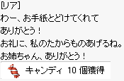 | 6.娘の「リアナ」に話しかけます。 すると「キャンディー10個」をもらえます。 | |