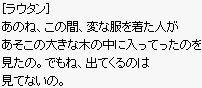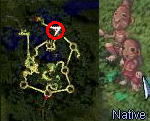 | 10.ウンバラの原住民「ラウタン」に話しかけます。 ここでウンバラ言語を習得している必要があります。 また「スマイルマスク」を持った状態で話しかけてください。 選択肢が出ますので「あげます」を選ぶと、 変な服を着た男があっちの木の方に行ったという話を聞きます。 | |