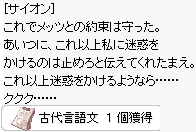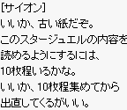 | 11.ウンバラダンジョン1Fへ向かいます。 建物内にいる気難しそうな男「サイオン」に話しかけます。 選択肢が出ますので「あのこれを・・・・・」を選択します。 そうすると「古い本のページ10個」を持ってくるように指示されます。 もし材料を持ってない状態で話しかけると彼に殴り飛ばされて強制的に部屋から出されてしまいます。 HPも減ります。 材料を渡すと、「古代言語文」をもらえます。 古い本のページは、7個だけ消費されます。 そしてメッツの所へ行くように言われます。 | |